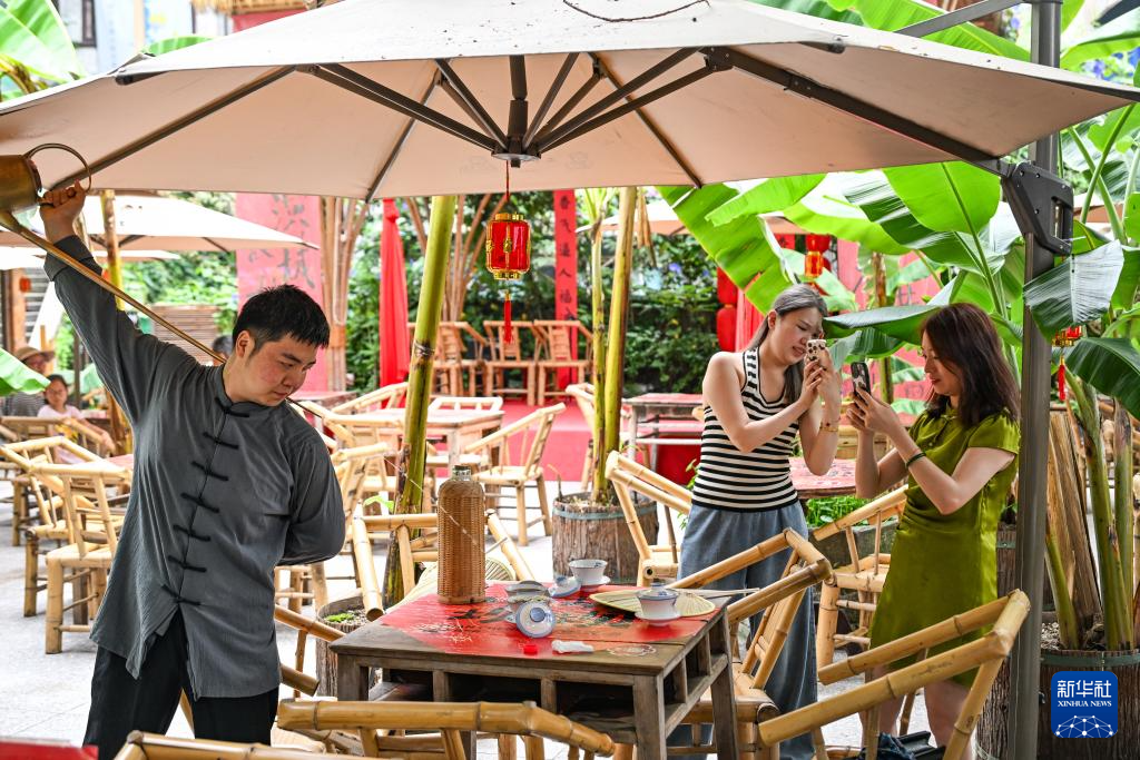 6月8日,在重慶市渝中區山城巷的一家露天茶館,茶藝表演者與游客互動。