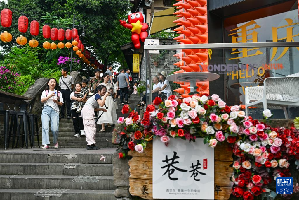 6月8日,游客在重慶市渝中區山城巷游覽、拍照。
