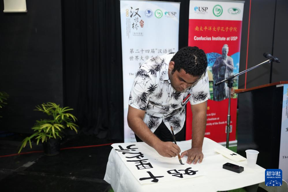 6月6日,在斐濟首都蘇瓦,“漢語橋”世界大學生中文比賽斐濟賽區比賽的參賽選手展示書法才藝。
