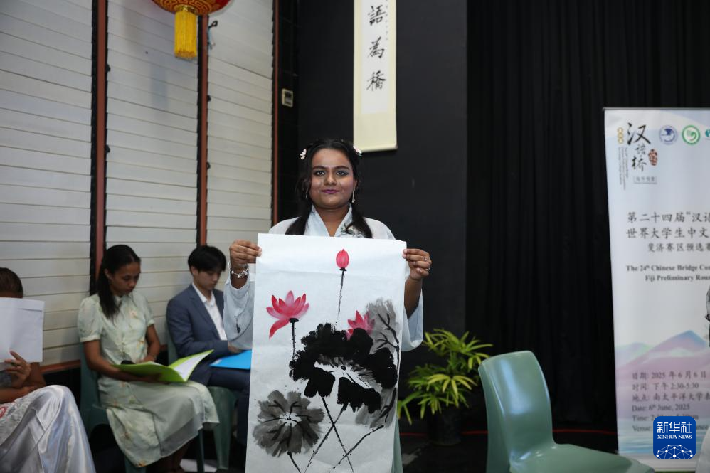 6月6日,在斐濟首都蘇瓦,“漢語橋”世界大學生中文比賽斐濟賽區比賽的參賽選手展示中國畫作品。