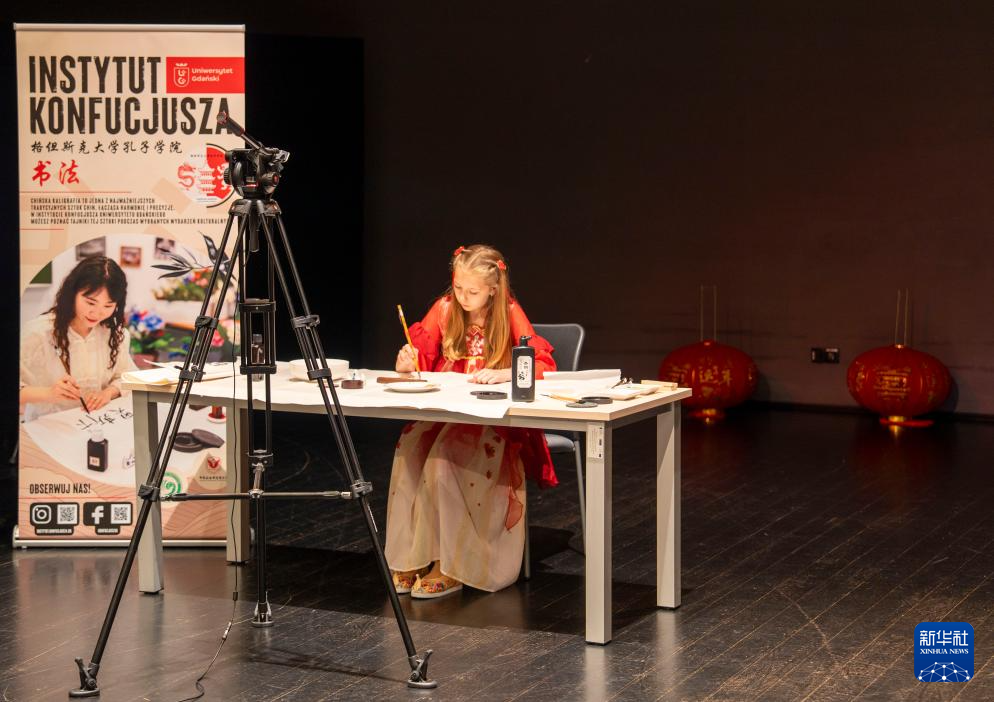 6月6日,在波蘭格但斯克,參加“漢語橋”中文比賽的小學生用毛筆作畫。