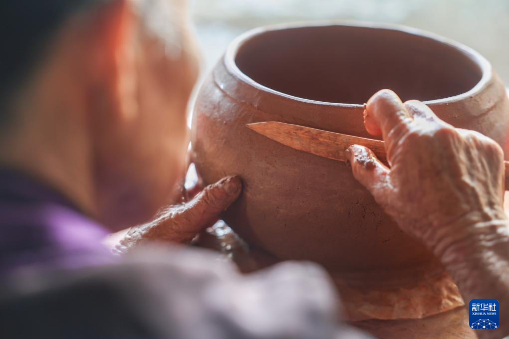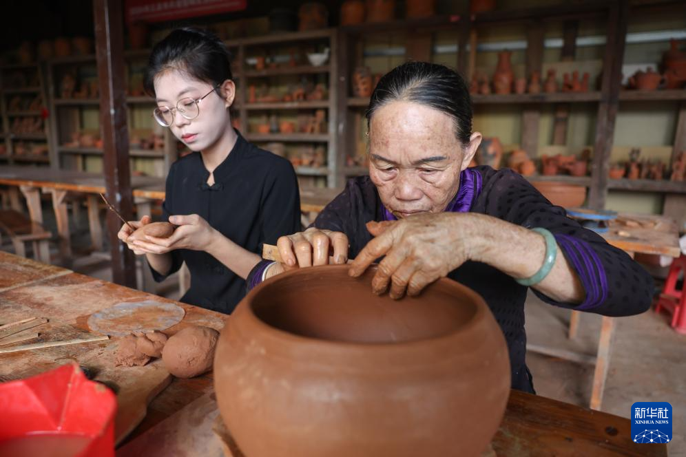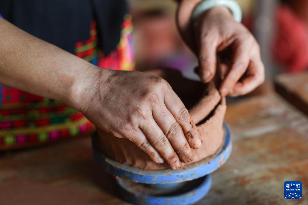 6月9日,在海南三亞黑土黎陶合作社里,村民董佳佳(左)和她的外婆胡其梅制作黎陶。