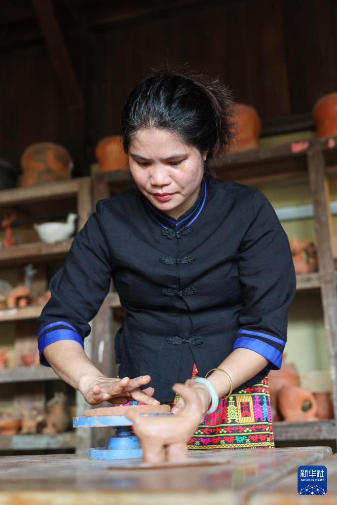 6月9日,在海南三亞黑土黎陶合作社里,村民董良姨制作黎陶。
