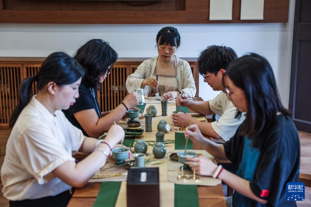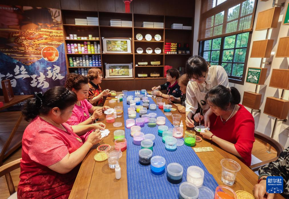 6月10日,游客在子城歡喜書店“江湖書局”民藝巷沉浸式體驗傳統掐絲琺瑯技藝。