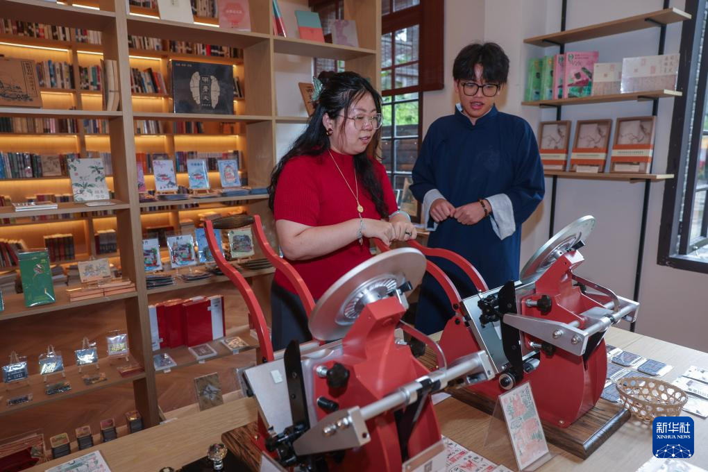 6月10日,游客(左)在子城歡喜書店一樓的中華書局體驗活版印刷互動項目。