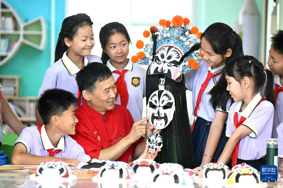6月10日,在石家莊市裕華西路小學,張建認向學生展示京劇臉譜。