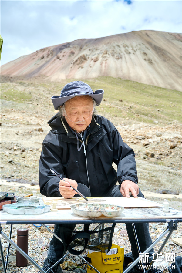 西藏中國高原畫派研究院院長、西藏自治區美術家協會名譽主席唐天源在廓瓊崗日冰川寫生