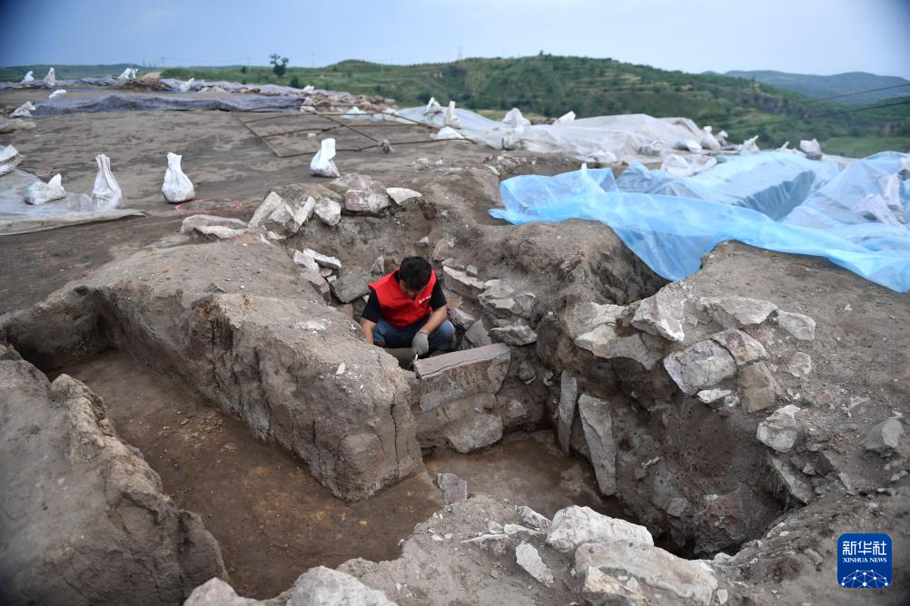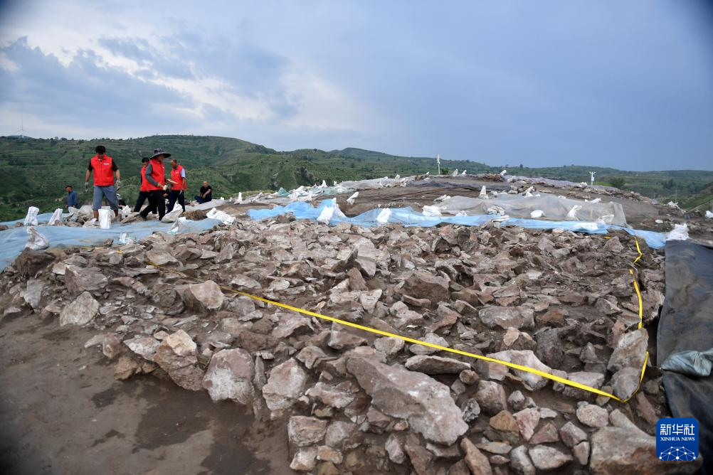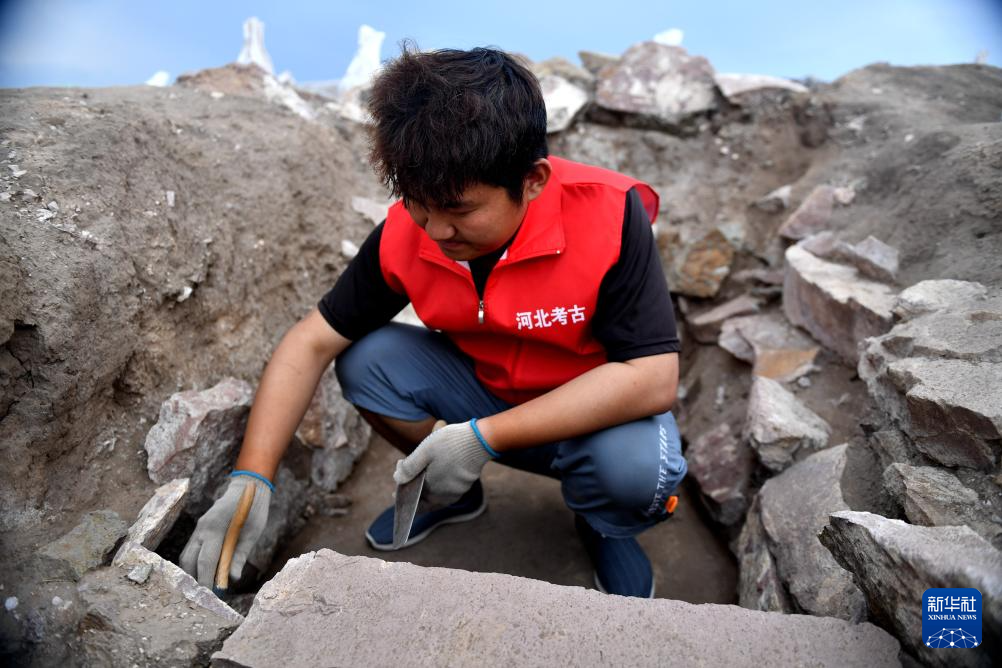 6月18日,宣化鄭家溝遺址考古發掘項目隊員在一號積石冢工作。