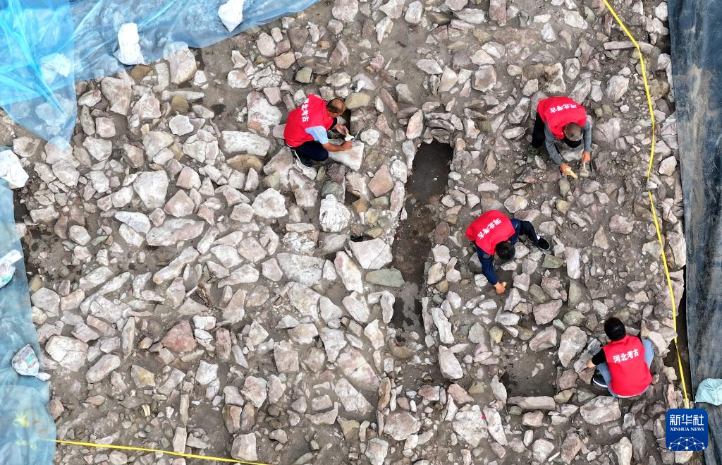 6月18日,宣化鄭家溝遺址考古發掘項目隊員在一號積石冢工作(無人機照片)。