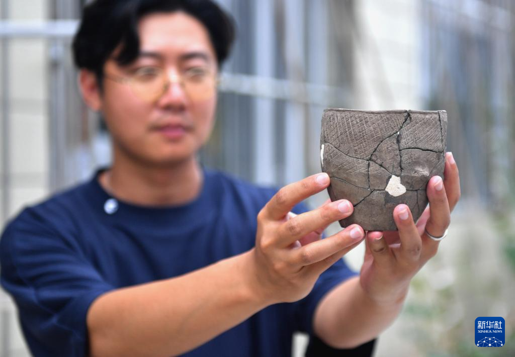 6月18日,宣化鄭家溝遺址考古發掘項目執行領隊龔湛清在展示出土的筒形罐。