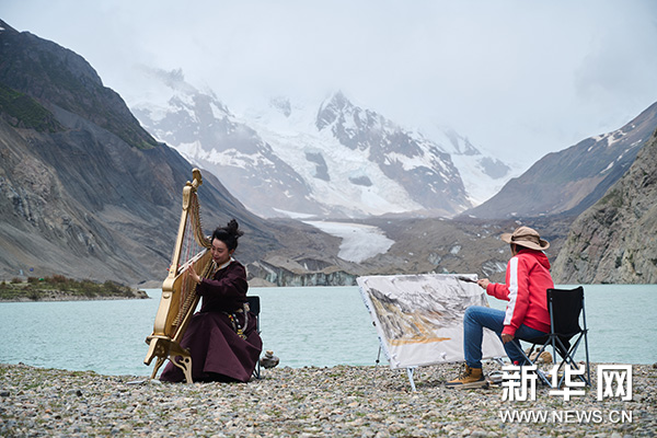 在祥格拉冰川,西藏中國高原畫派研究院院長、西藏自治區美術家協會名譽主席唐天源(右)現場寫生,中央民族樂團著名箜篌演奏家吳琳(左)演奏箜篌,達成藝術共鳴。