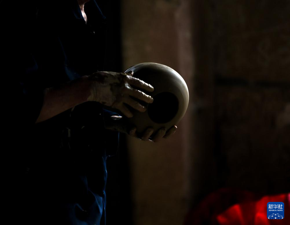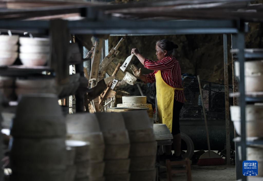 6月17日,制陶師傅方亮生在桂東縣普樂鎮陶瓷作坊制作陶器。