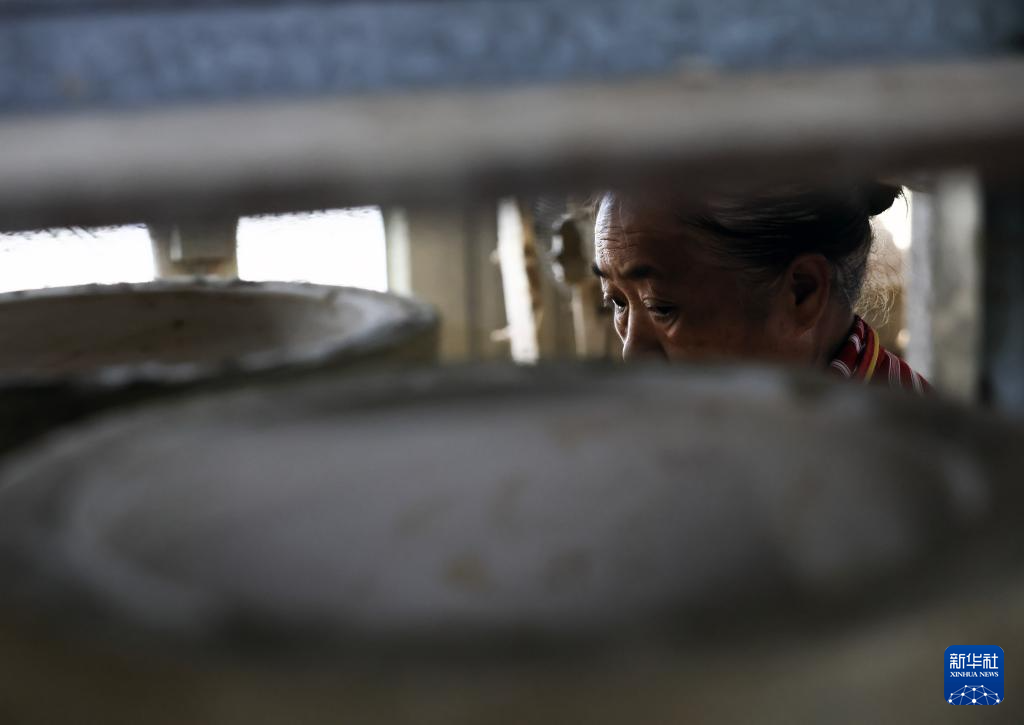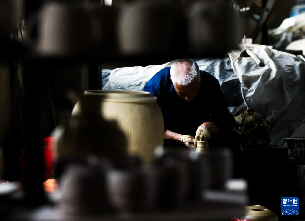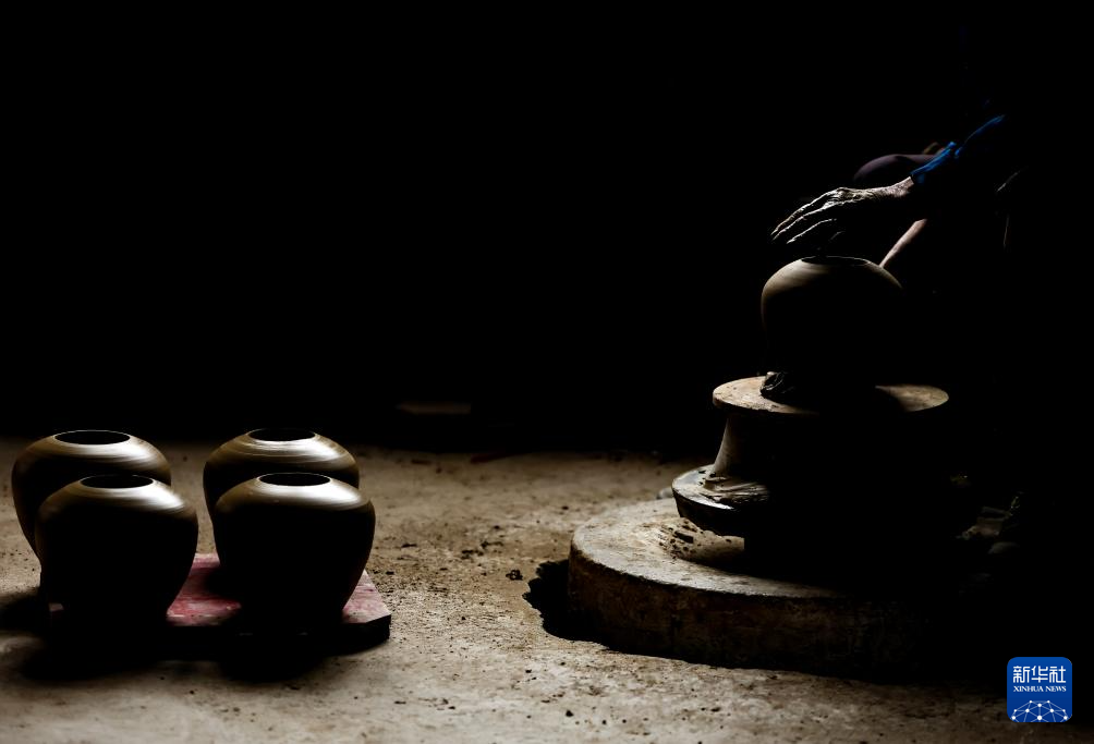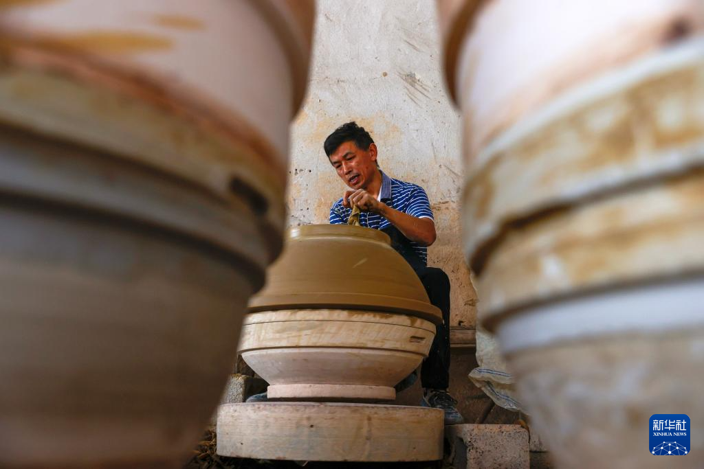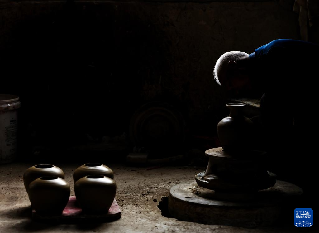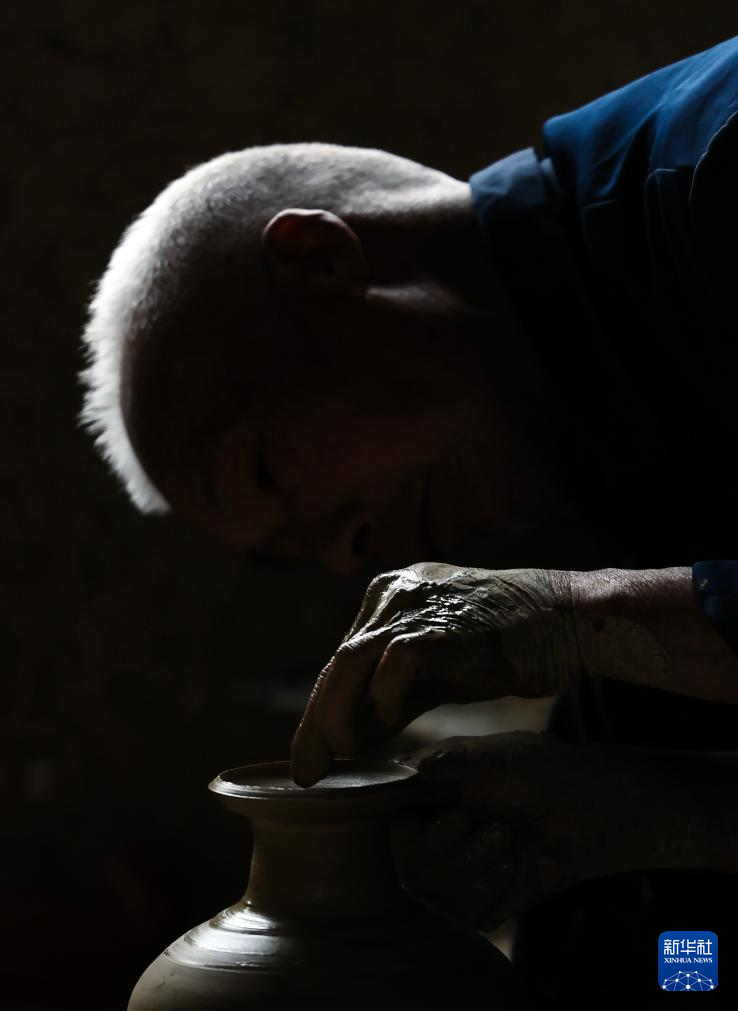 6月17日,制陶師傅鄧招財在桂東縣普樂鎮陶瓷作坊制作陶器。