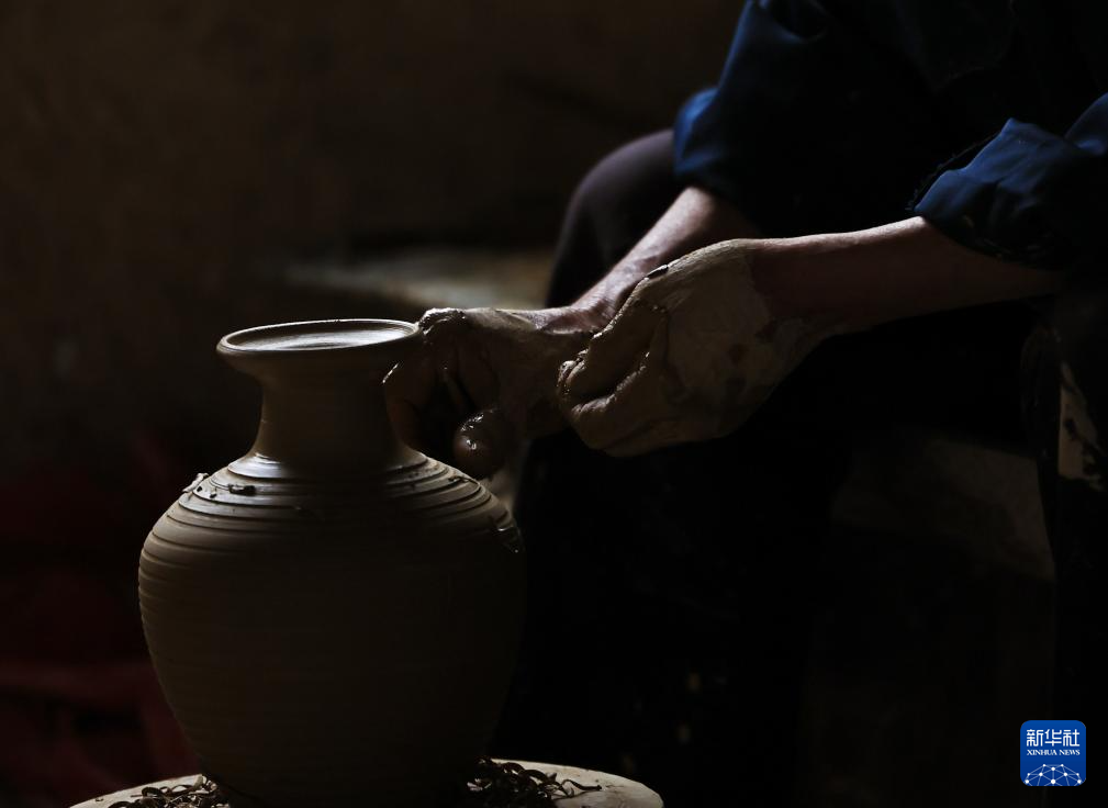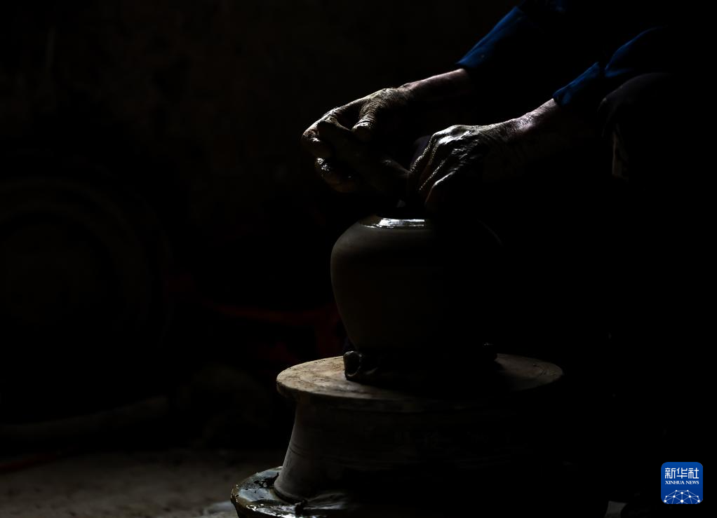 6月17日,制陶師傅方亮生在湖南省郴州市桂東縣普樂鎮陶瓷作坊制作陶器。