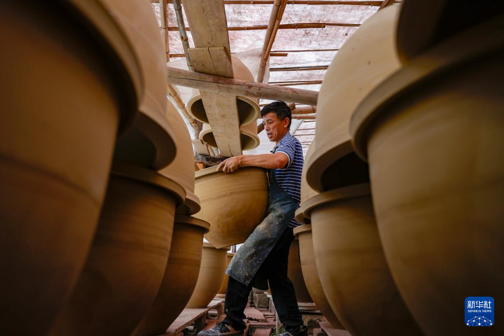 6月17日,制陶師傅方建飛在桂東縣普樂鎮陶瓷作坊搬運曬干的陶器。