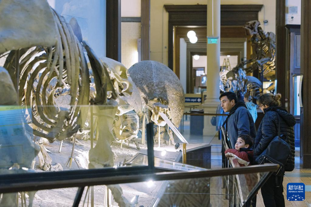 6月20日,一名小朋友在阿根廷拉普拉塔博物館內參觀藍鯨頭骨。