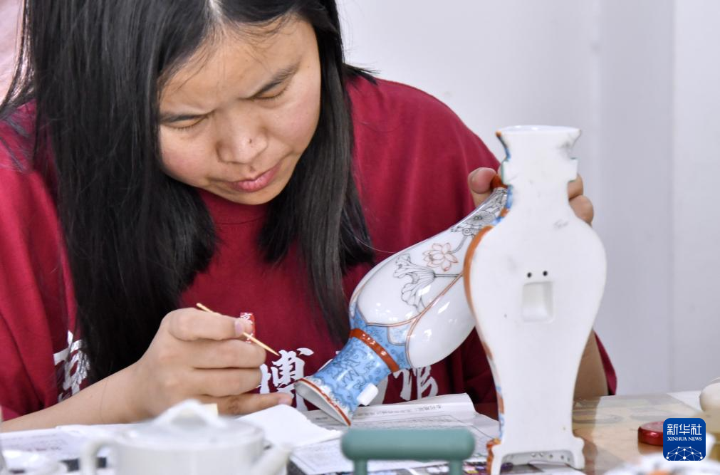 京彩瓷傳承人王春艷進行釉上彩繪(6月18日攝)。