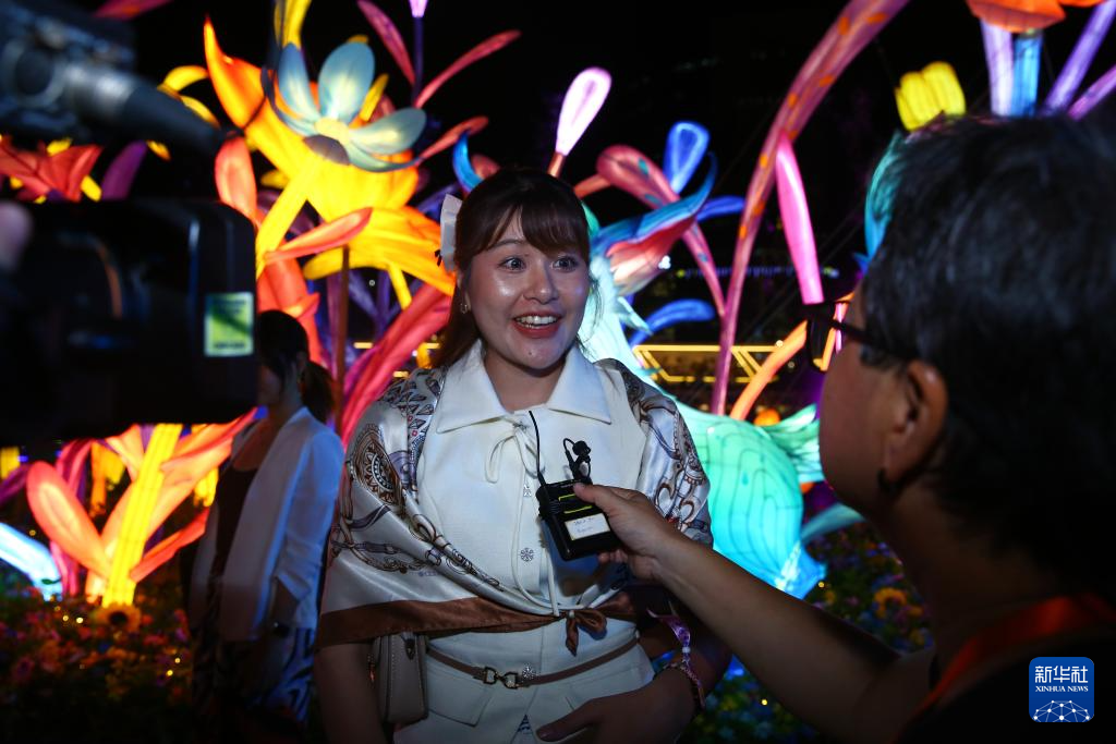6月28日晚,在泰國曼谷商業地標暹羅天地,泰國姑娘莎拜在燈會上接受新華社記者采訪。新華社記者 孫瑋彤 攝