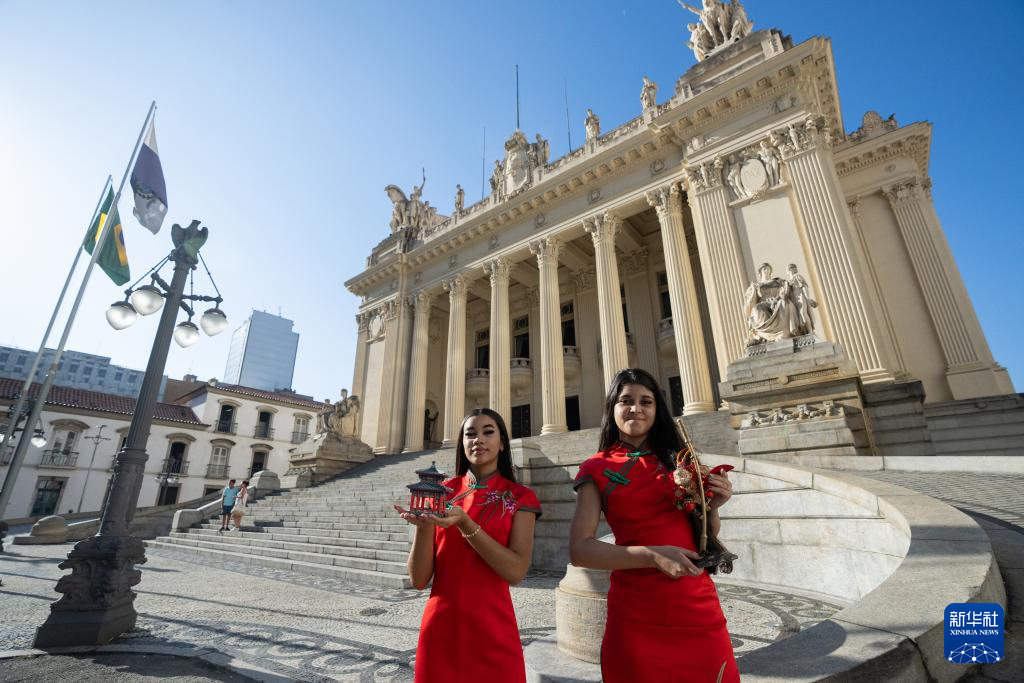 6月30日,兩位身著中國傳統服飾的青年志愿者在巴西里約熱內盧蒂拉登特斯宮外展示中國元素工藝品。