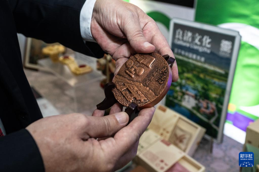 6月30日,在巴西里約熱內盧蒂拉登特斯宮,一名參觀者欣賞“良渚文化”主題工藝品。