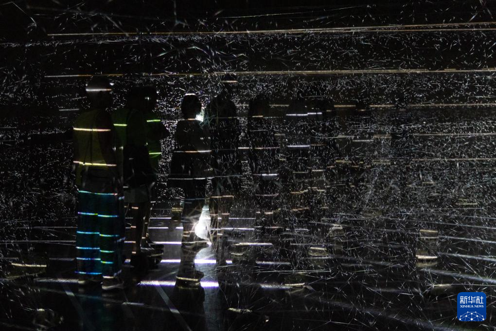 7月4日,在匈牙利佩奇,人們與燈光裝置互動。