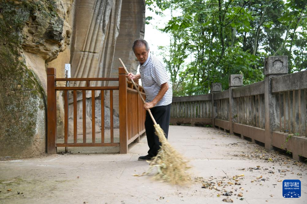 曾祥余在清掃石窟前的落葉(6月14日攝)。