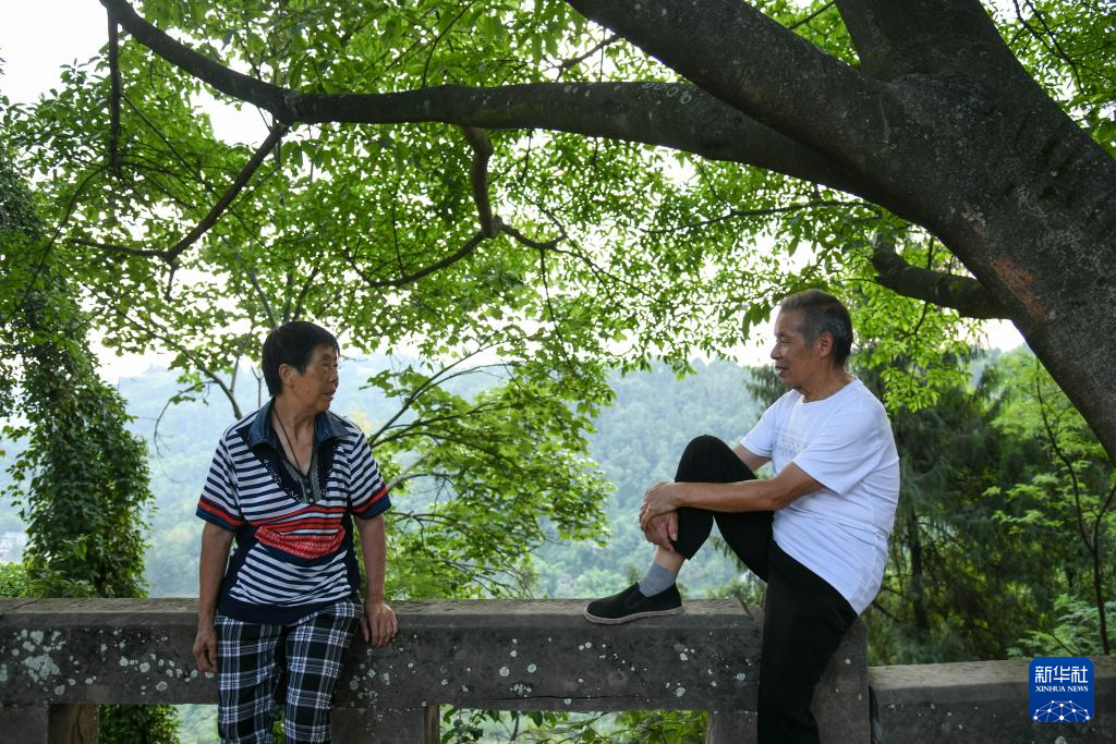 曾祥余(右)和老伴陳澤容在樹蔭下休息(6月14日攝)。