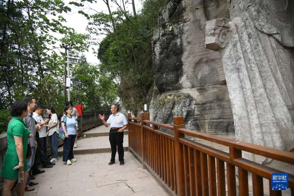 曾祥余(右一)為游客講解石窟內容(6月14日攝)。