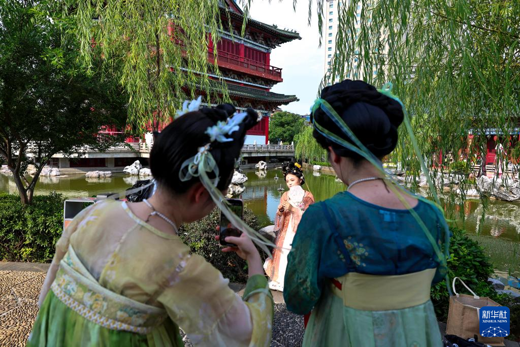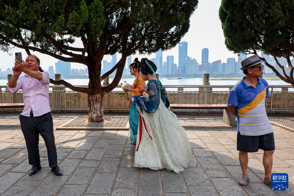 7月7日,身著古裝的游客在江西南昌滕王閣景區游覽留影。