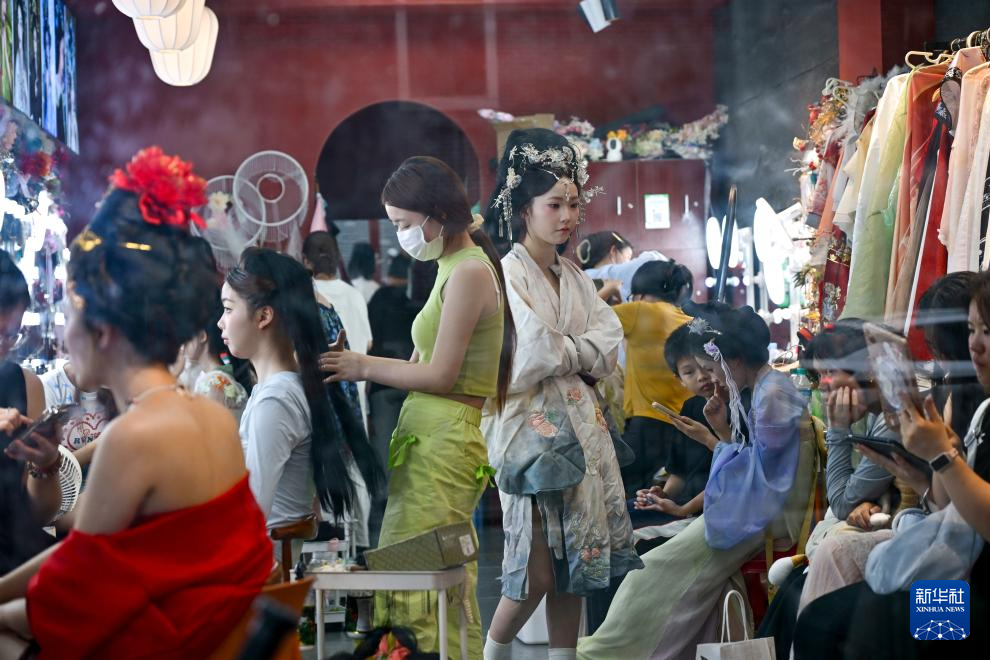 7月7日,傍晚時分,江西南昌滕王閣景區附近的一家旅拍店仍然客流不減。