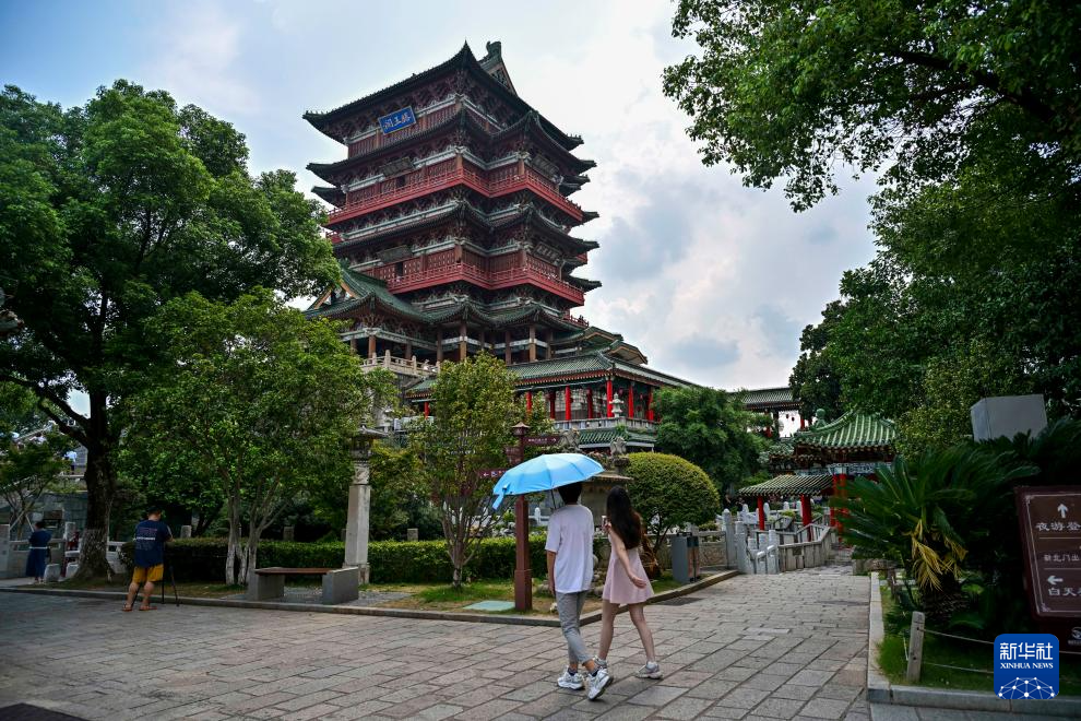 7月7日,游客在江西南昌滕王閣景區內休憩。
