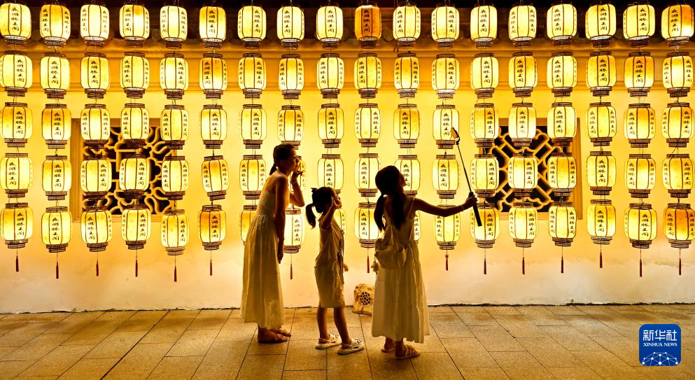 7月7日,游客在江西南昌滕王閣景區附近的半步街打卡留影。
