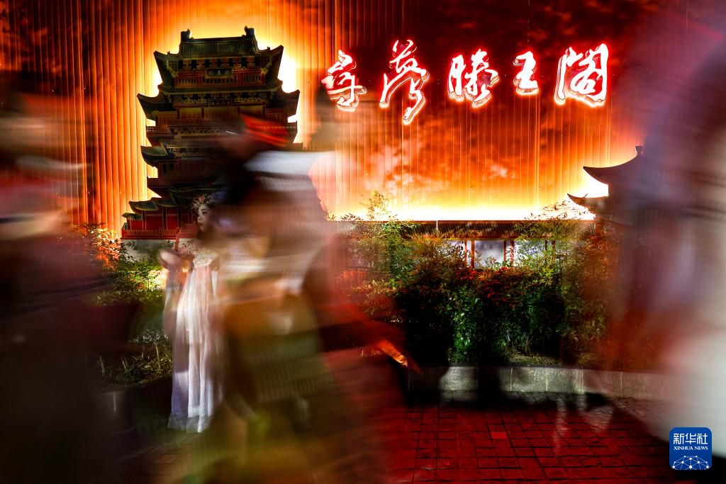7月7日,游客在夜間游覽江西南昌滕王閣景區。
