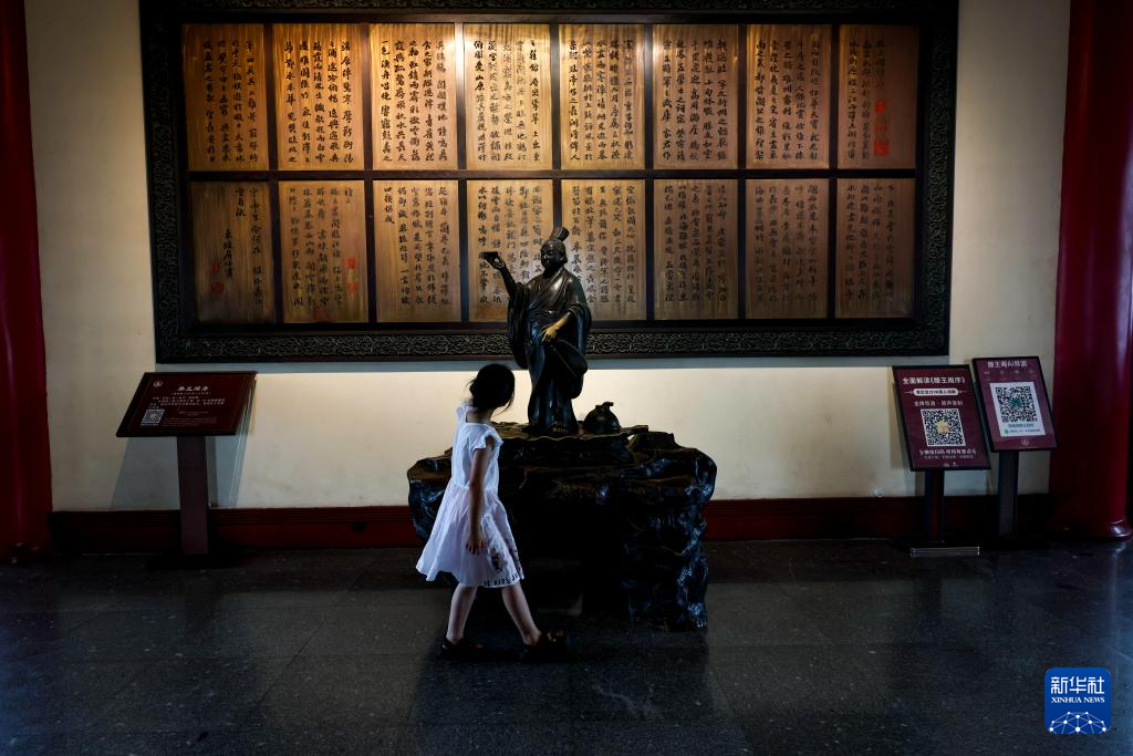 7月7日,一名小朋友在江西南昌滕王閣內的《滕王閣序》銅碑前駐足。