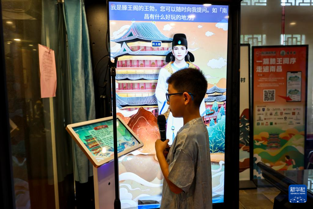 7月7日,一名來自河北秦皇島的小學生在江西南昌滕王閣景區游客中心的智能背序亭內背誦《滕王閣序》。近年來,滕王閣景區推出背誦《滕王閣序》全文免門票活動,吸引了各地游客前來挑戰。