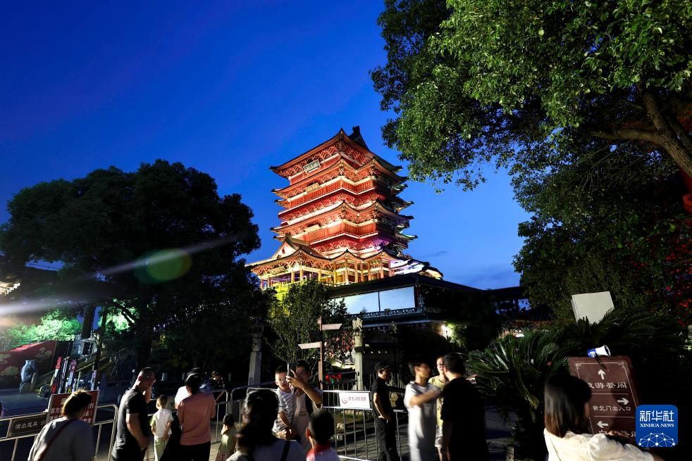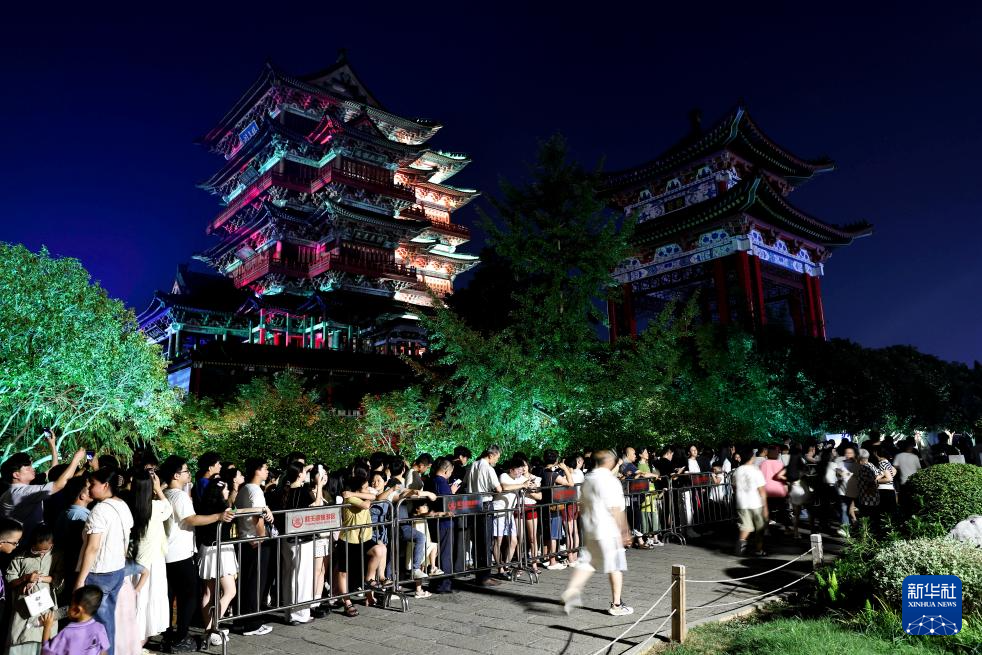 7月7日,夜間游覽的游客在江西南昌滕王閣景區內排隊等待登閣。