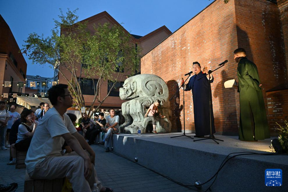 相聲演員在天美藝術街區露天空間為市民表演(7月12日攝)。