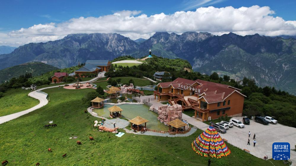 游客在舟曲拉尕山一處特色民宿外游覽(7月12日攝,無人機照片)。