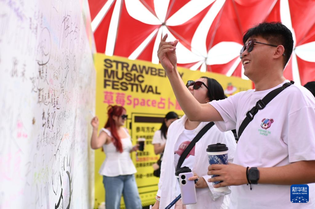 7月12日,在2025新疆超級草莓音樂節現場,人們參加簽名墻活動。