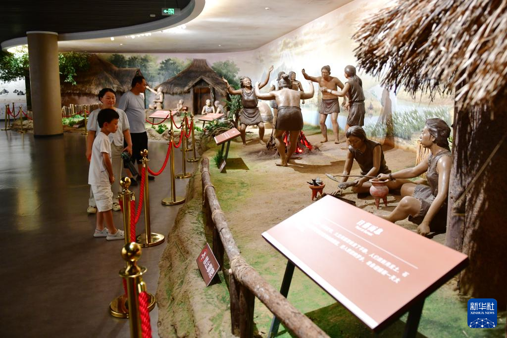7月14日,游客在大汶口遺址博物館內參觀先民生活場景復原模型。