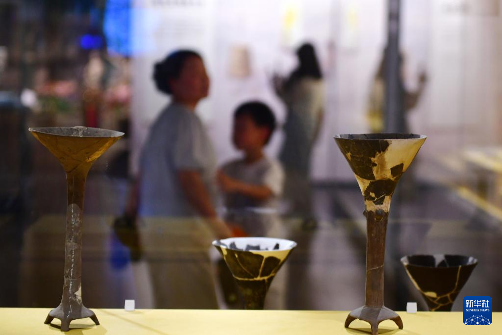 7月14日,游客在大汶口遺址博物館內參觀出土陶器。