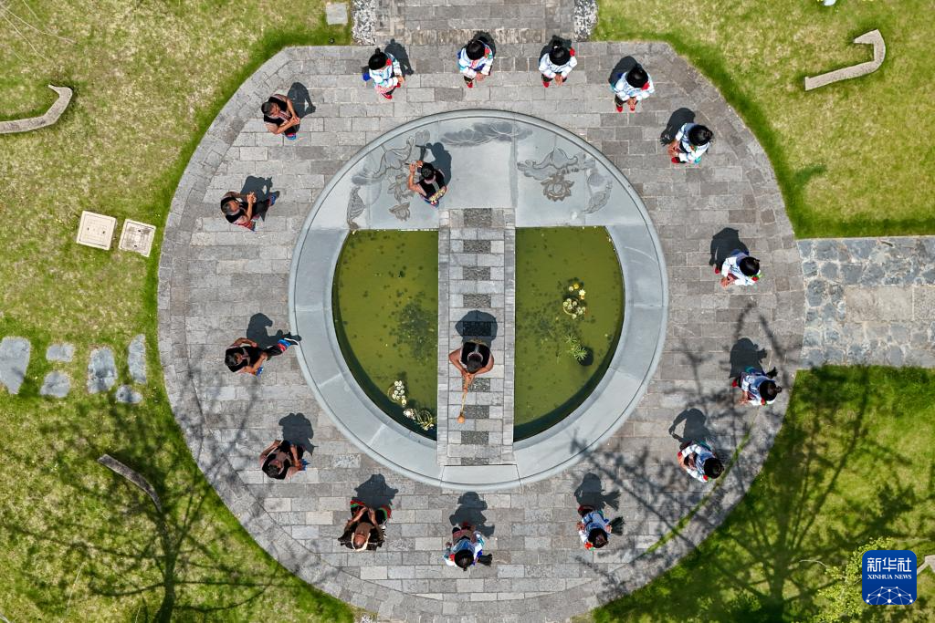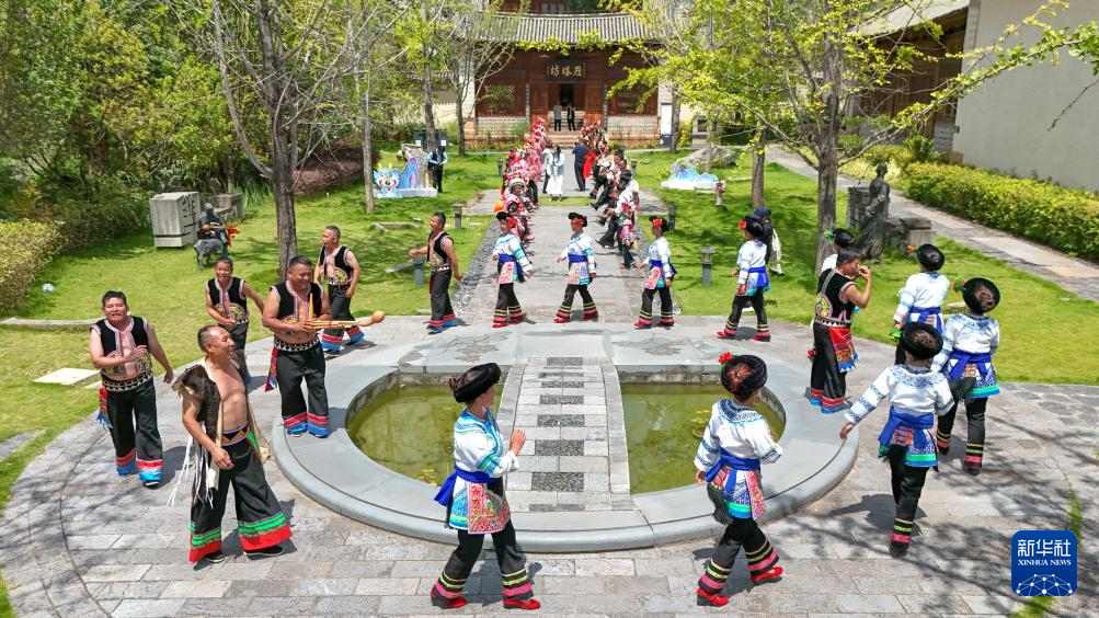 7月18日,彝族打歌隊在巍山縣文華書院排練(無人機照片)。