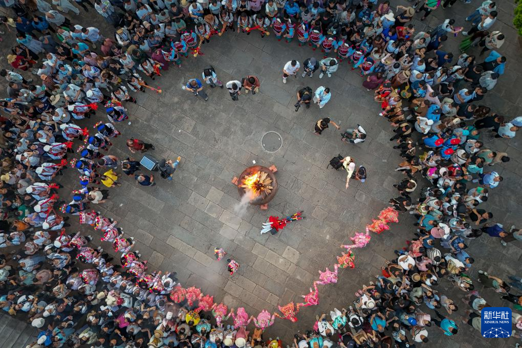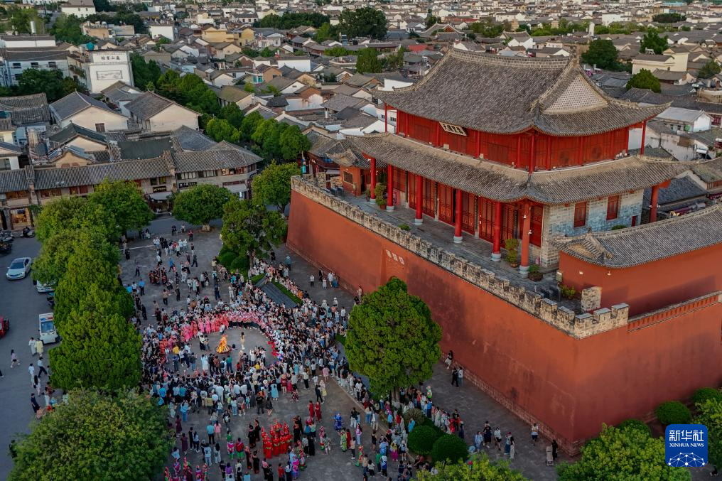 7月18日,彝族打歌隊在巍山縣拱辰樓廣場展演(無人機照片)。