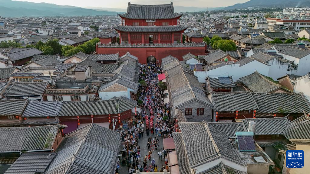 7月18日,彝族打歌隊在巍山縣南詔古街進行巡演(無人機照片)。