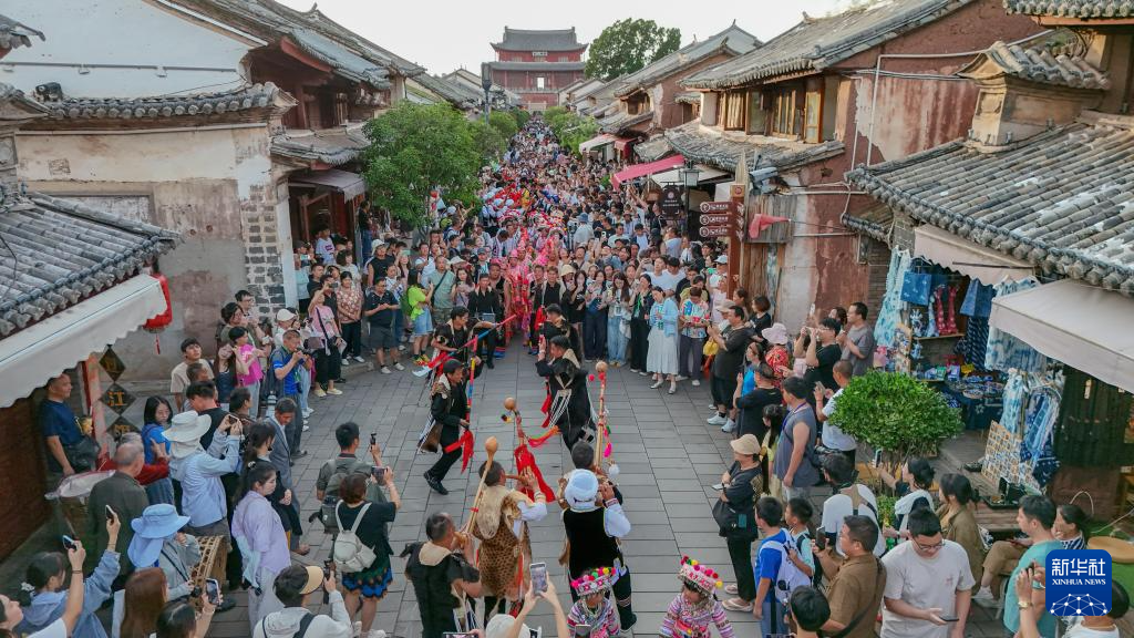 7月18日,彝族打歌隊在巍山縣南詔古街巡演。