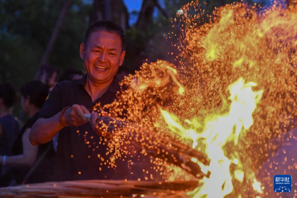 7月19日晚,游客用手機拍攝主火把被點燃的瞬間。