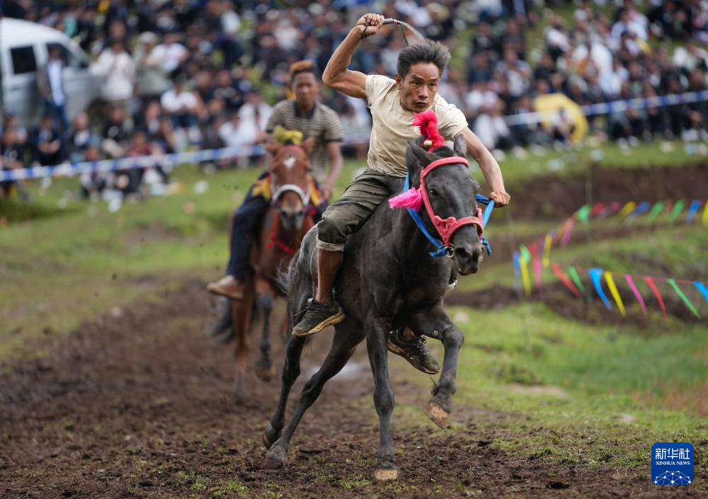 當地彝族群眾在布拖縣龍潭鎮包谷坪火把場參加賽馬(7月21日攝)。