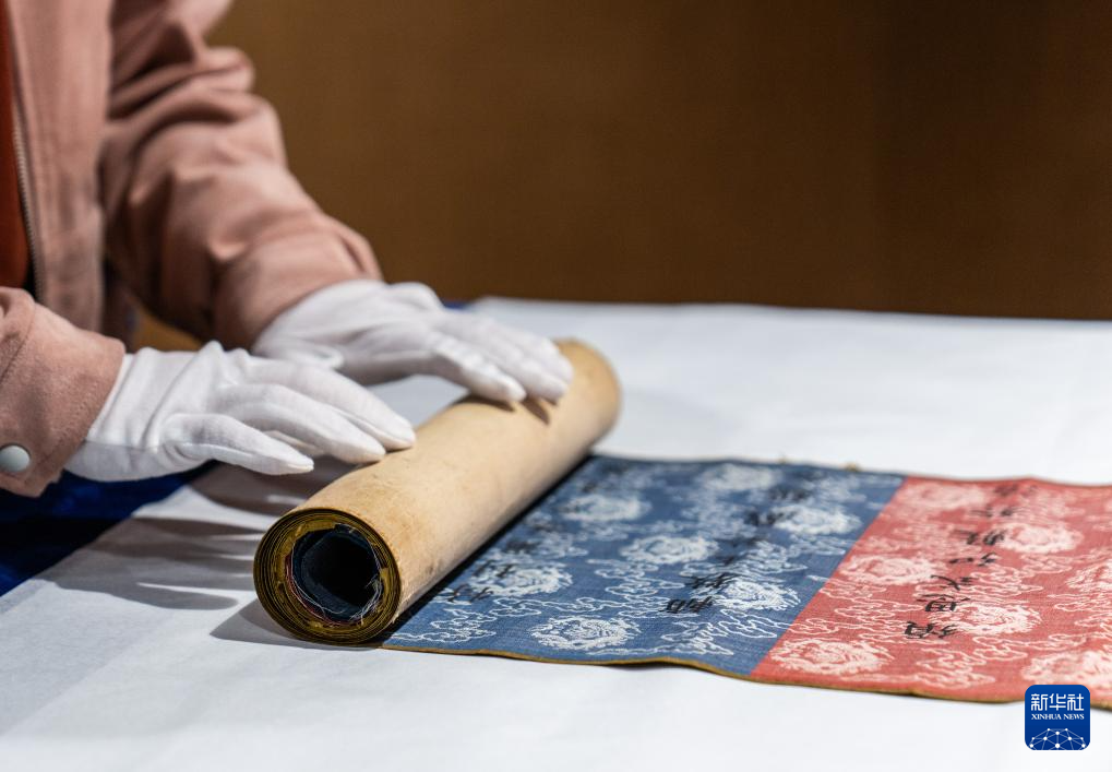 西藏博物館工作人員將《永樂十一年封斡喃渴烈思巴為輔教王誥書》徐徐展開(5月20日攝)。