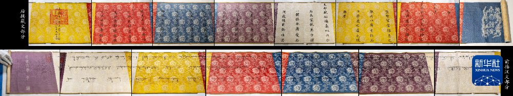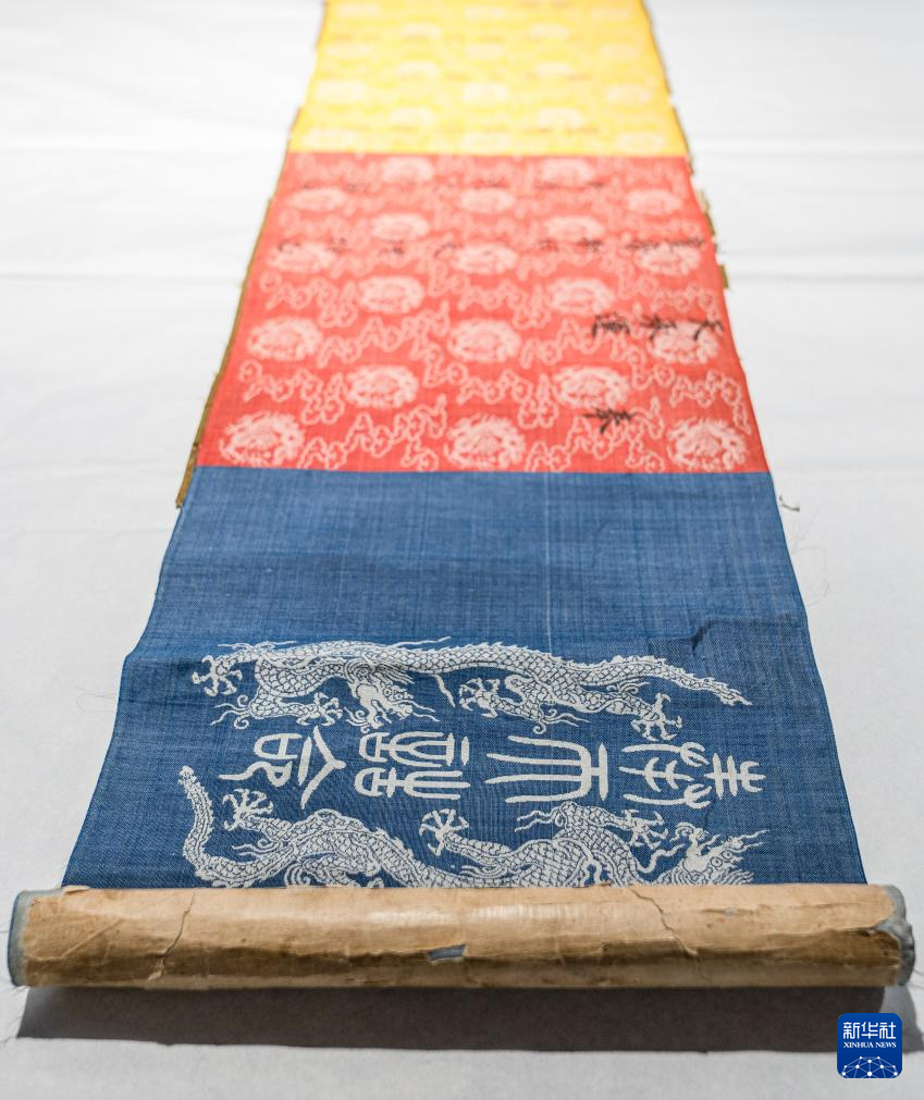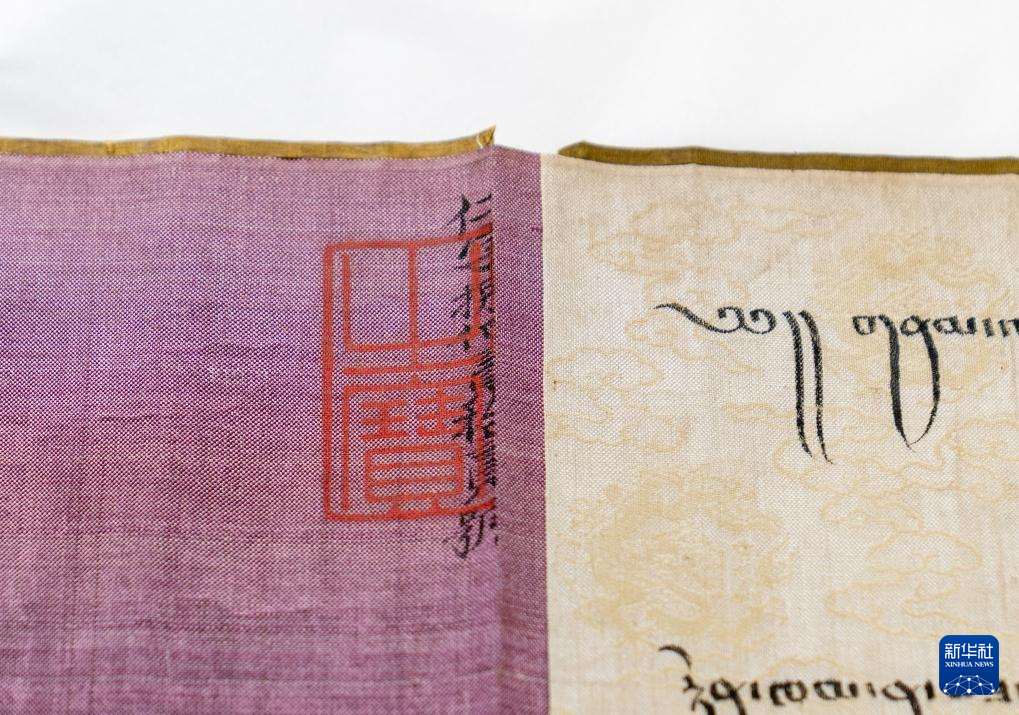 這是《永樂十一年封斡喃渴烈思巴為輔教王誥書》卷首(5月20日攝)。篆書“奉天誥命”四個字和雙龍圖案均是錦緞織造時應用提花技術以不同色彩的絲線織成。