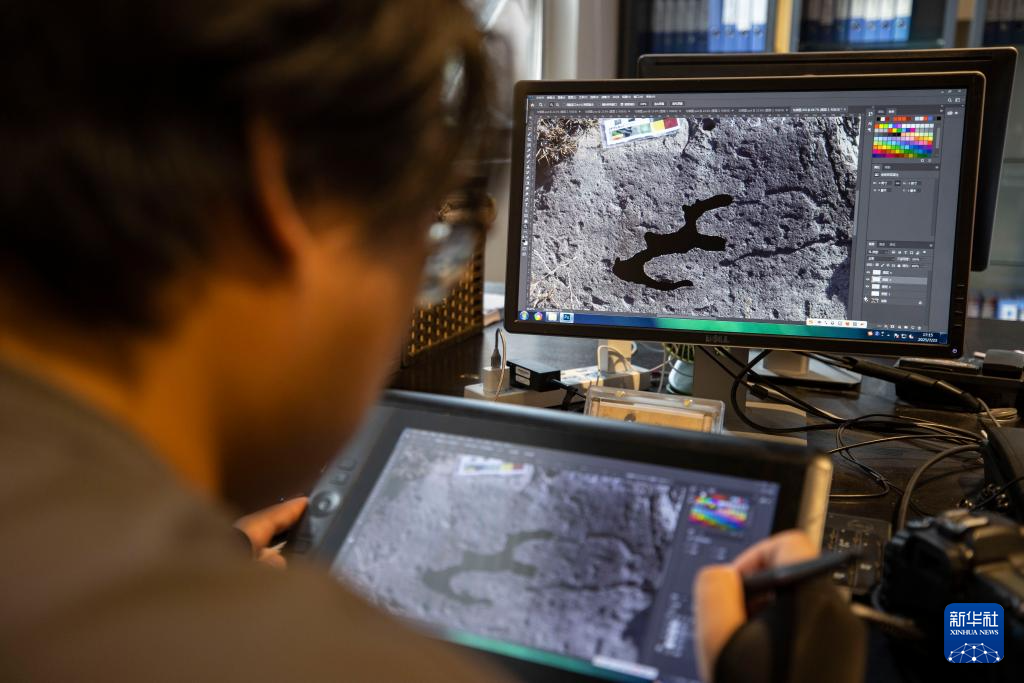 7月23日,工作人員在繪制巖畫電子線描圖。在巖畫普查工作中,巖畫電子線描圖是實景巖畫圖像數字化的一種輔助方式,使畫面清晰明確地呈現在巖畫信息資料庫中,便于日后查閱與研究工作。